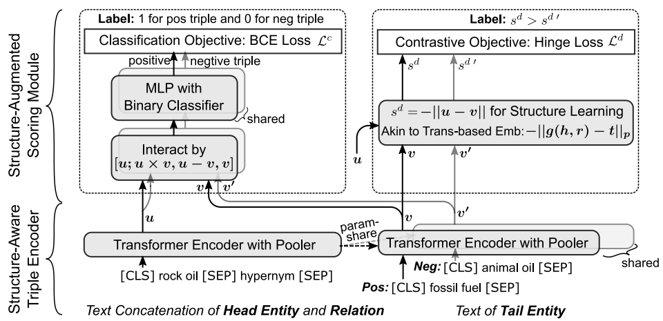 论文简介:本文致力于知识图谱补全领域,考虑到现存知识图谱补全方法的弊端,即图嵌入方法泛化能力差以及文本编码方法缺乏结构化知识且计算开销过大的问题,提出一种结构增强的文本表示学习方法,实现了两大类方法的优势互补。具体地,本文基于孪生网络结构,采用预训练语言模型做编码器以充分利用实体和关系的文本信息,并提出两种评分策略以同时建模上下文和结构信息。此外,本文提出了一种自适应集成方案,将两大类方法的得分做出自适应融合,进一步提高了知识图谱补全的性能。实验结果显示,我们的方法能够有效提高知识图谱补全的性能、速度和泛化能力。