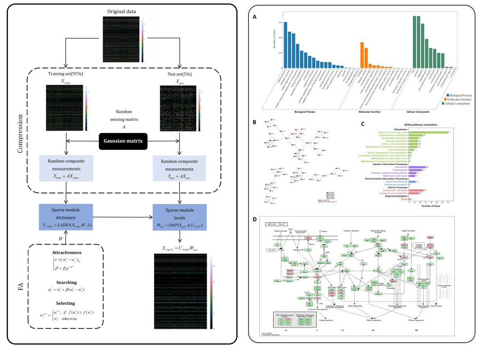 文章提出四种结合自然启发优化算法的压缩感知模型框架。算法通过自然启发优化算法引导压缩感知系统寻找高维稀疏的scRNA-seq数据的稀疏模块字典和层次,并利用吸引算子和搜索算子来提高原始数据的重构精度。并针对重构后的高维稀疏scRNA-seq数据进行差异基因分析、聚类分析、基因富集和KEGG分析,揭示该模型的有效性 。