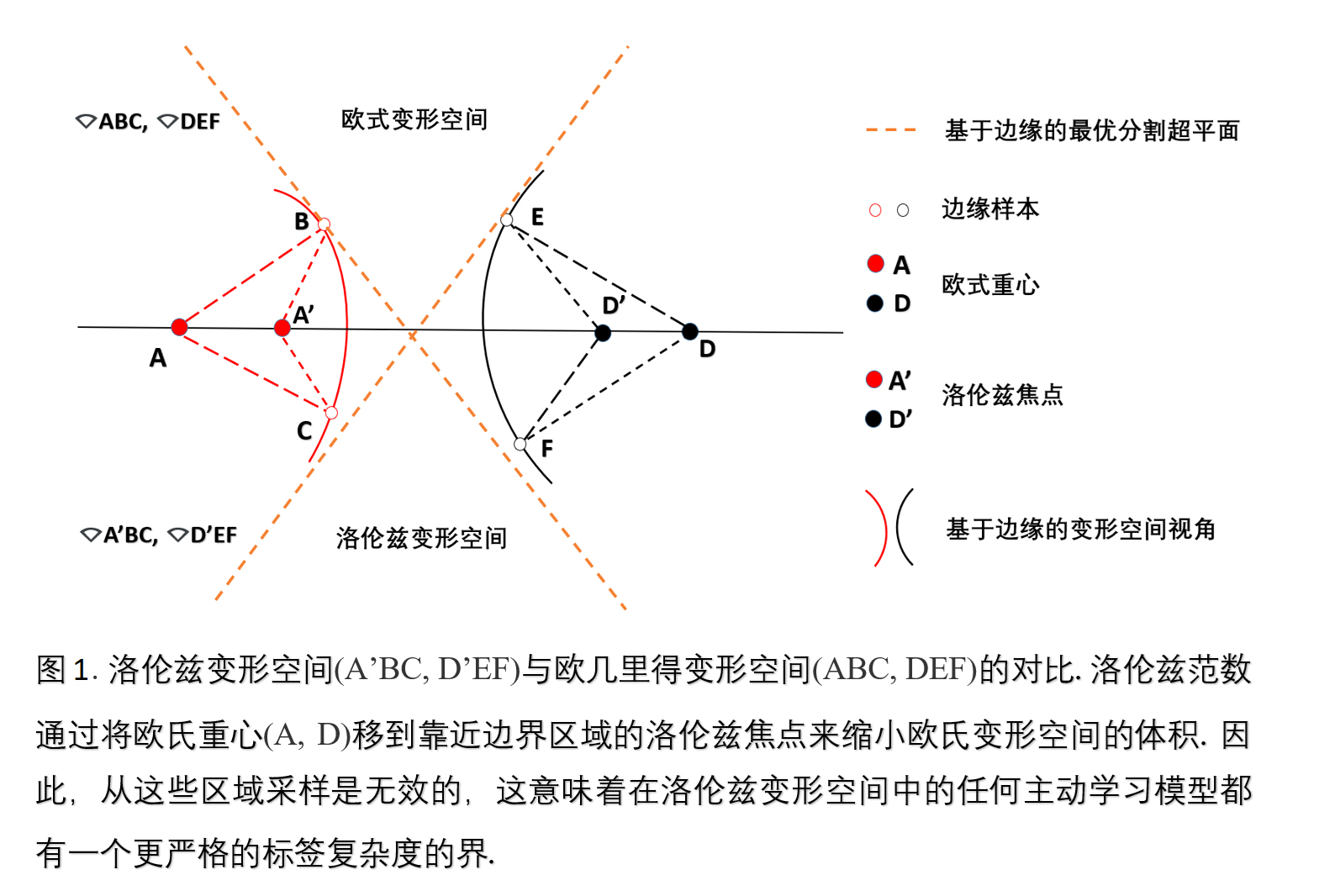 本文证明了在估计误差分歧系数不可行的场景下,如何构造分布差异系数寻找假设空间中的最优解,并使用“洛伦兹焦点” 构造洛伦兹变形空间,进一步缩减欧式变形空间,以获得更严格的标签复杂度的界。本文的动机如下图所示:
