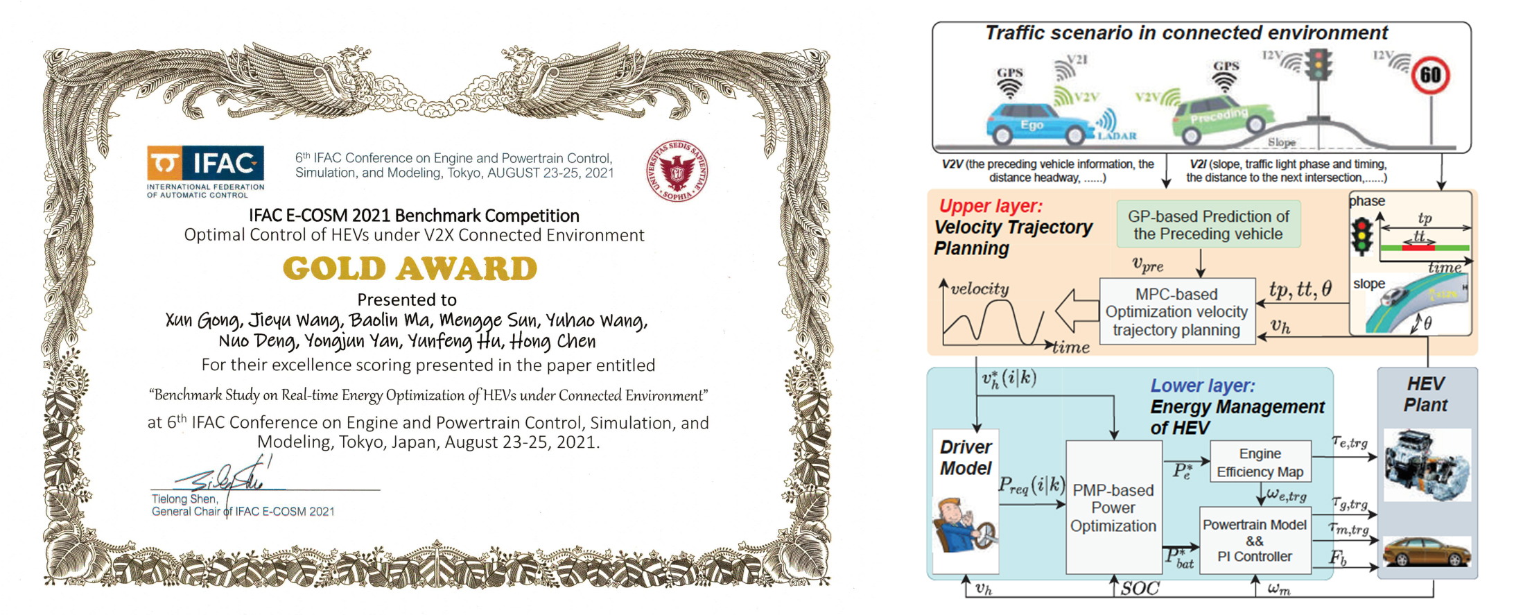 IFAC E-COSM是先进汽车动力系统控制领域的国际权威会议,每三年举办一届。本次会议的Benchmark挑战赛题目由日本、瑞典等国家的领域权威学者和日本丰田公司资深工程师联合提出,面向学术界和工业界共同关注的网联新能源汽车节能前沿技术,聚焦城市工况混合动力汽车实时优化控制问题,旨在为挖掘网联环境下汽车节能潜力提供理论参考标准。公司团队经过数月的精诚合作,提出了AI驱动的网联混合动力汽车分层式滚动时域优化节能控制方案。通过大会主办方设置的城市工况综合仿真测试、论文评审等环节,方案的实时性和可靠性得到了充分验证,获得了国际专家组的一致肯定,并最终以全程总油耗1156.4g,领先第二名德国亚琛工业大学团队33.1g的成绩获得冠军。