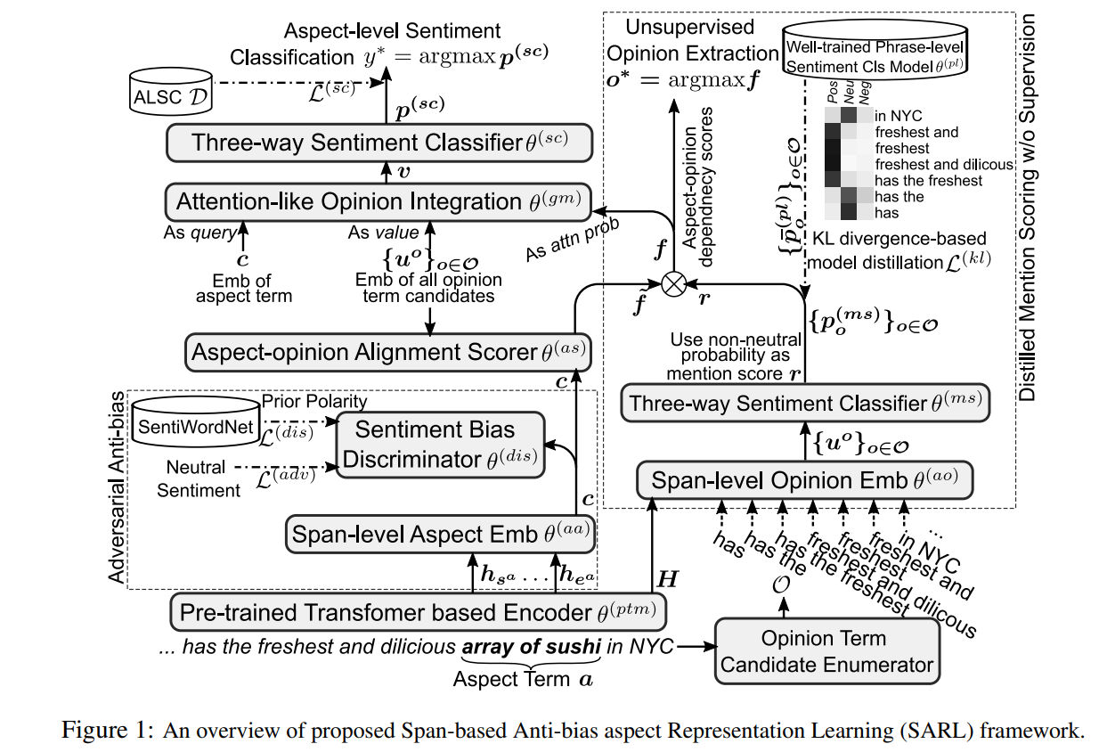 在本文中,我们提出了一种span-based反情感偏见的方面词表示学习框架(SARL)。首先,它首先利用方面词的先验情感进行对抗学习来消除方面词嵌入表示中的情感偏见。随后,它通过span-based依赖关系建模来将意见词和与其对应的经过蒸馏学习得到的候选意见词进行对齐,实现了无监督意见词抽取,并为ALSC提供可解释性。本文中提出的方法在5个数据集上实现了领先的性能,且具备无监督意见词抽取的能力,能够有效的解决方面级情感分类问题,并为分类结果提供可解释性。