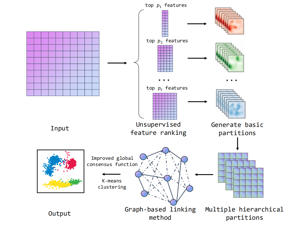 本文提出了一种基于图的多层次集成聚类算法(GMHCC),用于解决癌症数据和单细胞RNA数据的聚类分析问题。算法采用基于图的无监督特征排序和基于图的链接方法来发现集成聚类基本分区的多重层次信息,并对多种类型的高通量生物分子数据进行聚类分析。我们首先使用一个基于图的无监督特征度量模型来排序每个特征。然后,为了保持基本分区的多样性和鲁棒性,算法提取了多个不同的特征子集来生成多个基本分区,并通过优化全局一致性函数来探索数据的层次结构。最后,我们在35个癌症数据集和8个单细胞RNA数据集上的聚类结果和下游分析证明了我们方法的有效性。本工作结合了集成聚类与生物信息学等多学科交叉的优势共同完成。 主要合作者为香港城市大学Ka-Chun Wong 教授。