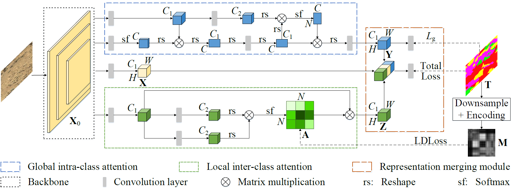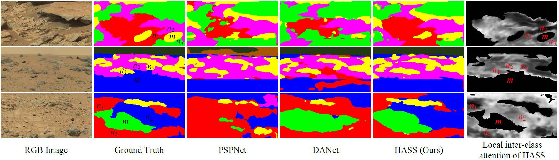 论文概述:火星地形的语义分割对于火星车的路径规划和自主导航有着重要的辅助作用。然而现有的语义分割网络多数用于结构化或半结构化场景,在完全非结构化的火星环境中表现不佳。为此,本文提出了一个基于混合注意力的火星地形语义分割网络(HASS)。该网络包含一个全局类内注意力分支,一个局部类间注意力分支,和一个特征聚合模块。具体而言,全局类内注意力分支用于探索整个图像中所有同类像素的一致性信息;局部类间注意力分支在所设计的损失函数(LDLoss)的监督下建立相邻的异类地形间的上下文关系;聚合模块融合上述两分支提取的特征以实现最终的火星地貌分割。在AI4Mars和自制数据集上进行的大量实验展现了我们所提出的网络的优越性。