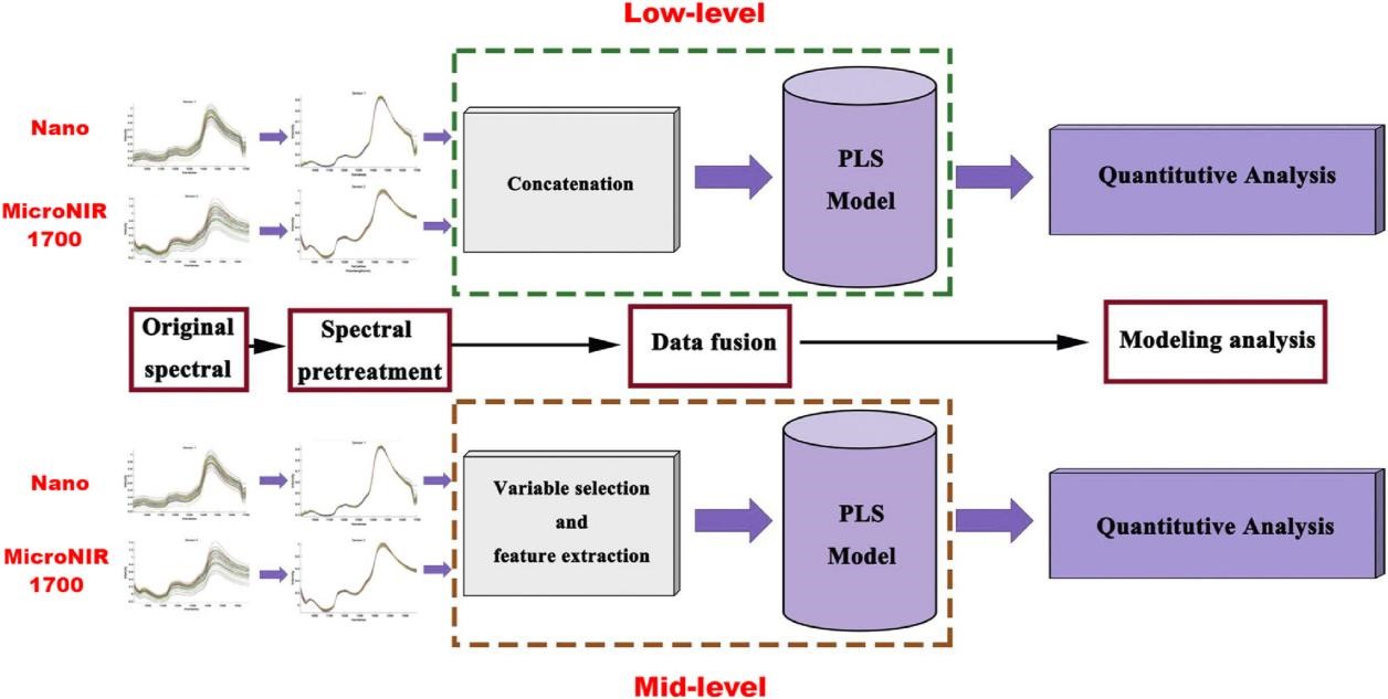 本文提出了一种基于波长选择的多块数据融合算法,用于材料的理化性质检测。首先基于近红外光谱技术(NIRS),运用偏最小二乘法(PLS)和主成分分析(PCA)两种化学计量建模方法,构建了果肉的可溶性固物和硬度的高精度预测模型。然后,采用联合区间偏最小二乘法和遗传算法(Si-GA-PLS)相结合的策略建立了预测精度更高的可溶性固物和硬度预测模型。最后,探讨了不同单色器原理的模型性能比较,利用数据融合提高预测能力。通过中级数据融合获得的结果比使用基于单一光学单色器的模型表现出更好的性能。这项工作结合了光学、光谱学、仪器科学和机器学习等多学科交叉的优势共同完成,产学研用一体化,为开发一种可以扩展到其他材料的新型质量测量系统提供了一些见解。课题组下一步将致力于基于多步混合波长选择策略的化学计量学方法建立多种材料的通用模型。
