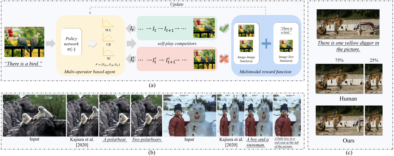 论文概述:由于手机,平板,电脑等不同电子设备的广泛使用,图像重定向(image retargeting)的相关研究获得了广泛关注。传统的基于内容感知的图像重定向方法可以自动地将图像重新定位到不同的纵横比同时保留重要的图像内容。但是用户很难与其交互控制重定向结果。本文提出了一个语言引导的多样化图像重定向方法。用户可以通过提供不同的文本描述控制重定向过程生成多样化的重定向结果。为了实现这一控制过程,我们将图像重定向过程看作为多步预测过程。其中,Multi-operator based agent作为决策者预测每一步中最优的operator对图像进行处理,而Multimodal reward function用于对每一步的预测结果进行评估并返回结果的Reward值用于优化Agent。我们还引入了CLIP用于图文相似度度量,使我们的重定向结果与原始图像相似的同时又符合文本描述的内容。