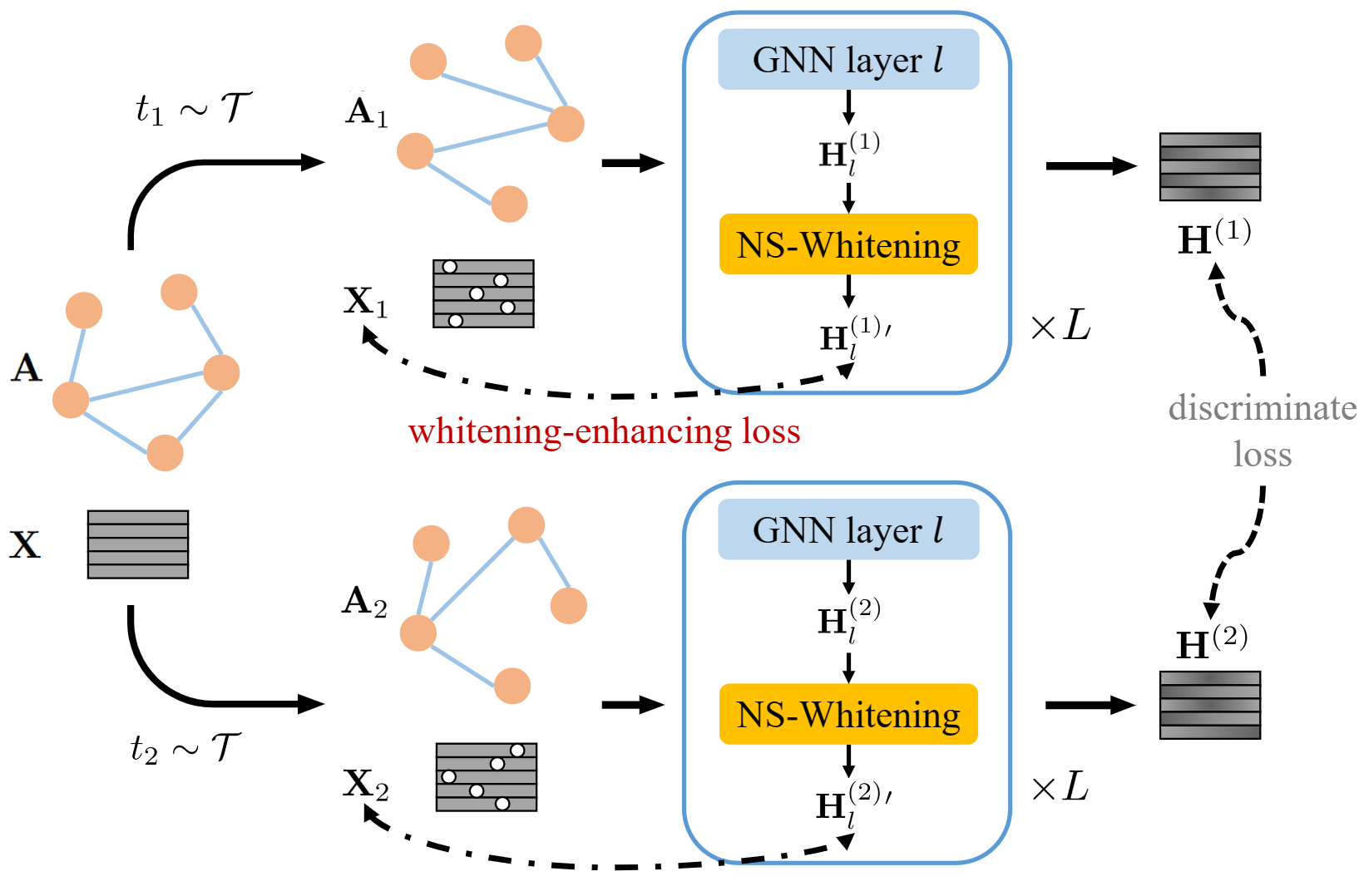 图:提出的白化图对比学习(WGCL)插件在两个方面改进了传统的GCL。首先,在每个GNN层之后引入了一个节点洗牌白化模块,以去相关节点嵌入的维度。其次,为了进一步增强白化的效果,引入了增强白化的损失,以最大化输入特征和每一层嵌入之间的互信息。结果,WGCL插件去相关了节点嵌入的维度,从而提高了下游任务的性能。