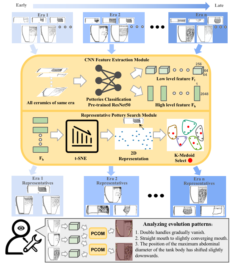 陶器作为早期人类广泛使用的工具,蕴含着丰富的历史信息。深度神经网络已被应用于陶器数字图像分析,省去了复杂的手工特征提取。然而,现有模型仅关注陶器形状的比较,忽视了其在不同历史时期的演变分析。在本研究中,我们提出了一种基于深度学习的方法,帮助专家识别特定时间段内某种陶器类型的演变模式。首先,我们训练了一个卷积神经网络用于陶器分类,提取代表不同年代陶器样本的低级和高级特征。接下来,我们采用聚类算法,根据高级特征识别各历史时期的代表性陶器。为了便于直观比较不同年代的陶器,我们使用浅层特征并计算陶器之间的余弦相似度,从而可视化形状和装饰的差异。这种方法通过视觉分析直接增强了对陶器演变模式的理解。我们通过在大坝沟和庙子沟考古遗址的数据上验证了我们提出方法的有效性和效率,并展现了明显的演变模式。我们的方法有效且高效地识别出各个时代的代表性文物,揭示了它们的演变模式,所得结论与专家的分析相当,同时相比于传统的手工方法显著节省了时间。