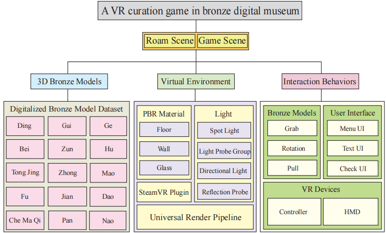中国青铜器是中国文化遗产中的重要组成部分,是中华文明的象征。虚拟博物馆和VR游戏化文化遗产学习已经广泛应用于文化遗产学习领域,这在一定程度上激发参观者的兴趣和探索欲。然而,现有的虚拟博物馆过于静态,缺乏参观者与文化遗产间的交互行为设计,参观者的参与度不高。现有的VR游戏化文化遗产学习的研究中,为参观者提供的可交互学习的文化遗产的数量过少,交互元素的设计不够简洁明了。这些缺陷都会导致参观者的享受程度不高。在本研究中,我们开发了一个集成三个关卡的闯关式VR游戏化虚拟博物馆策展,帮助参观者更好的学习中国青铜器的相关知识。首先,我们使用3D激光扫描仪对bg大游集团官网博物馆的青铜器进行扫描,再通过软件处理获取3D青铜器模型。接下来,我们搭建了虚拟博物馆的漫游场景和游戏场景。为了更好的激发参观者学习记忆中国青铜器知识的兴趣,我们设计了游戏逻辑和丰富的交互行为,从而使参观者有更好的游览体验。我们通过系统可用性实验和对比实验验证了我们系统的可用性和显著性优势。与传统的虚拟博物馆相比,我们的系统有效的提高了参观者的沉浸感,参与度以及对中国青铜器知识的记忆。