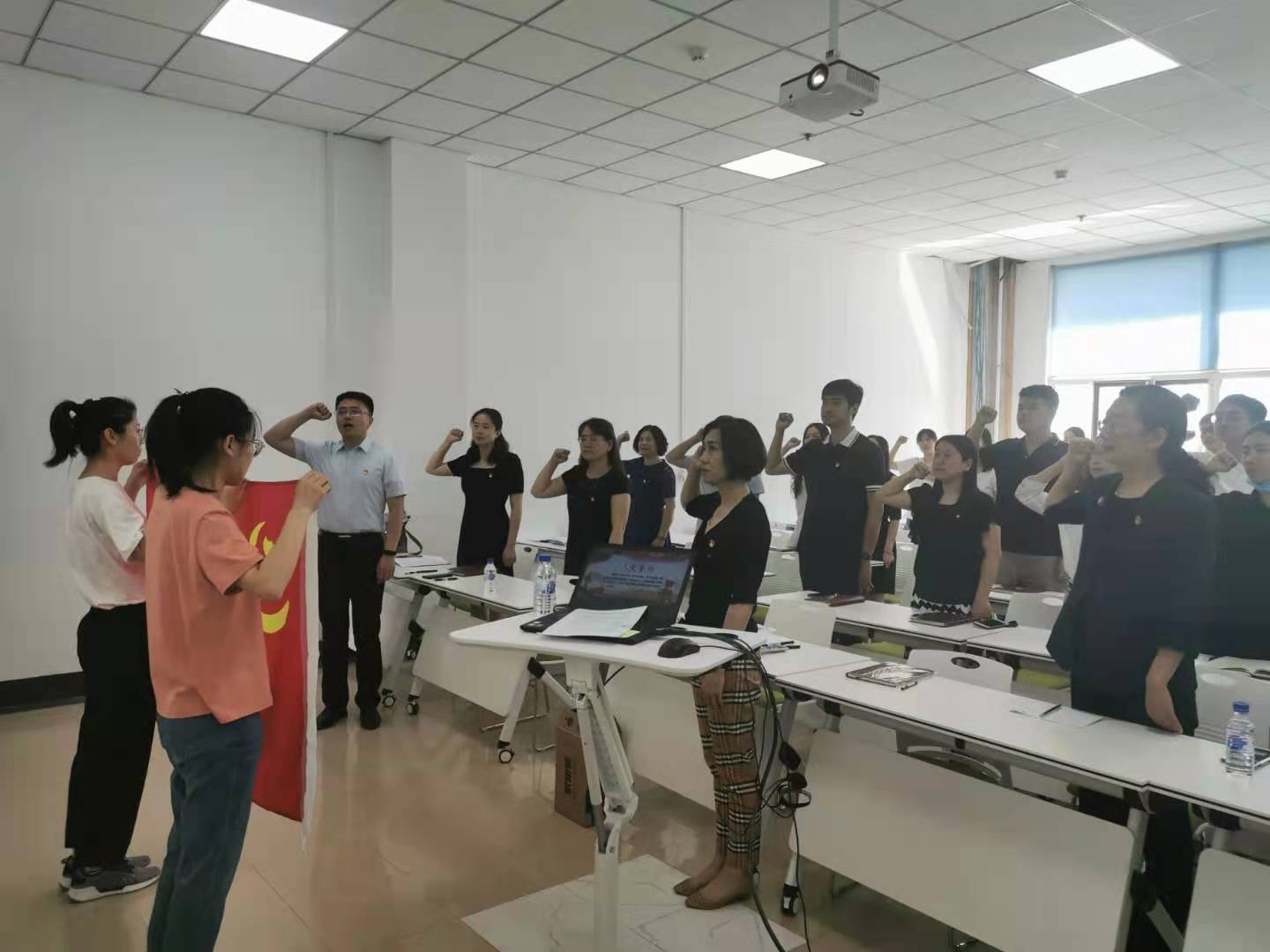 活动伊始,在公司教工党支部书记韩小伟同志的带领下,与会人员全体起立,高举右手,面对党旗,再次庄严宣誓:“我志愿加入中国共产党……随时准备为党和人民牺牲一切,永不叛党。”铿锵恢宏的誓词,强烈震撼着在场的每一位党员,一字一句,神圣而豪迈,铮铮誓言,体现了党员同志们对中国共产党的无限忠诚,坚定了入党使命,奋斗初心。