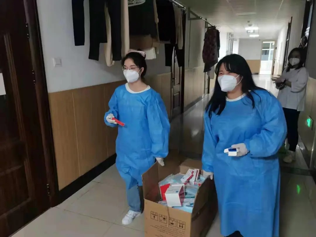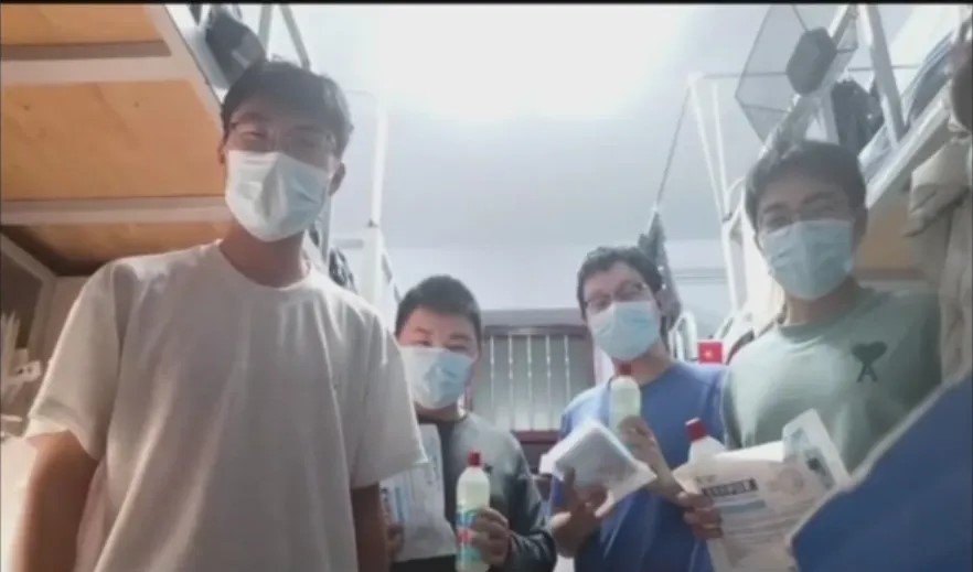 文苑二公寓403寝室的志愿者们说:志愿工作中同学们的一声声“谢谢”,一句句肯定,让我感受到疫情中的温暖。我们在平凡的岗位上履行着我们的责任,用实际行动保障着文二的安全。每天的搬水、发放试剂盒虽然劳累,但我们有文二同学的支持,有四楼同学的肯定,我们一定会战胜困难,勇往直前!