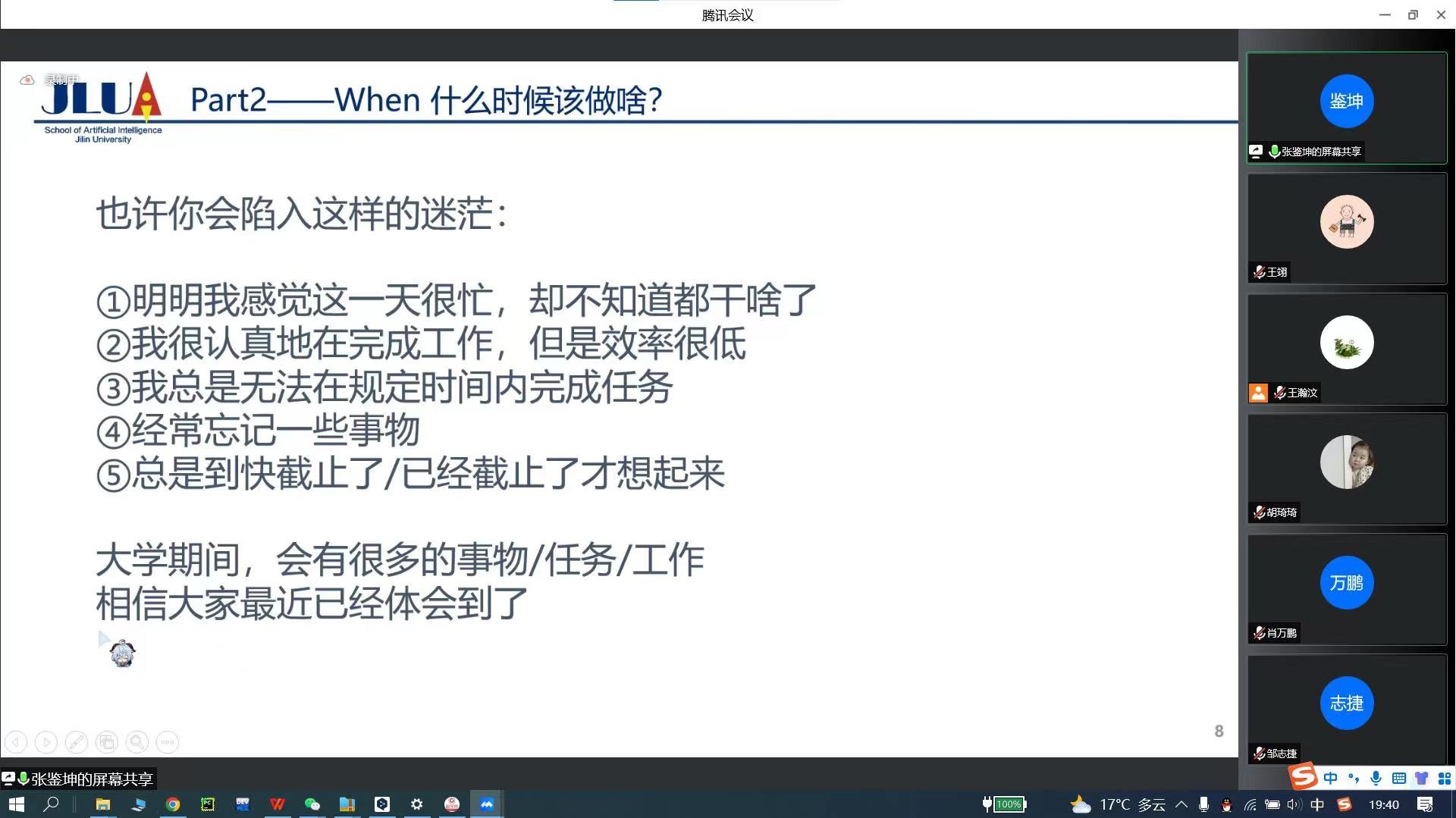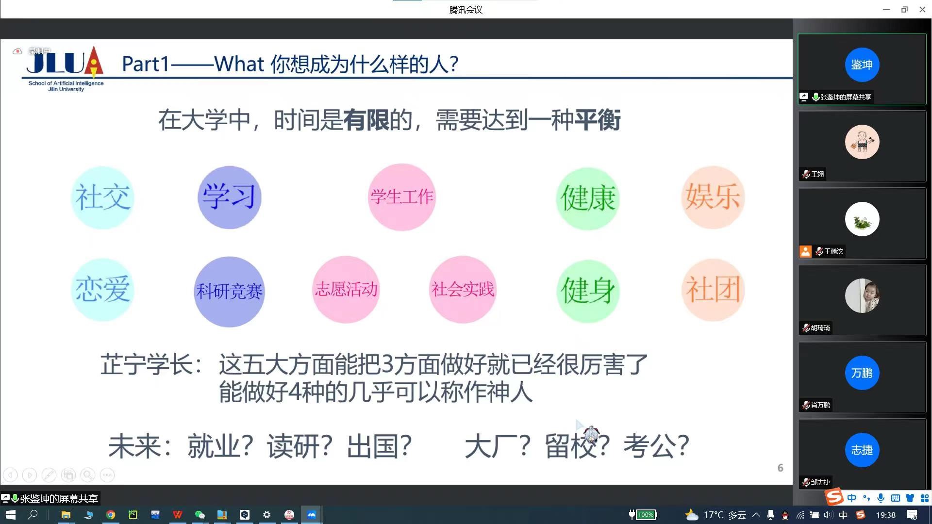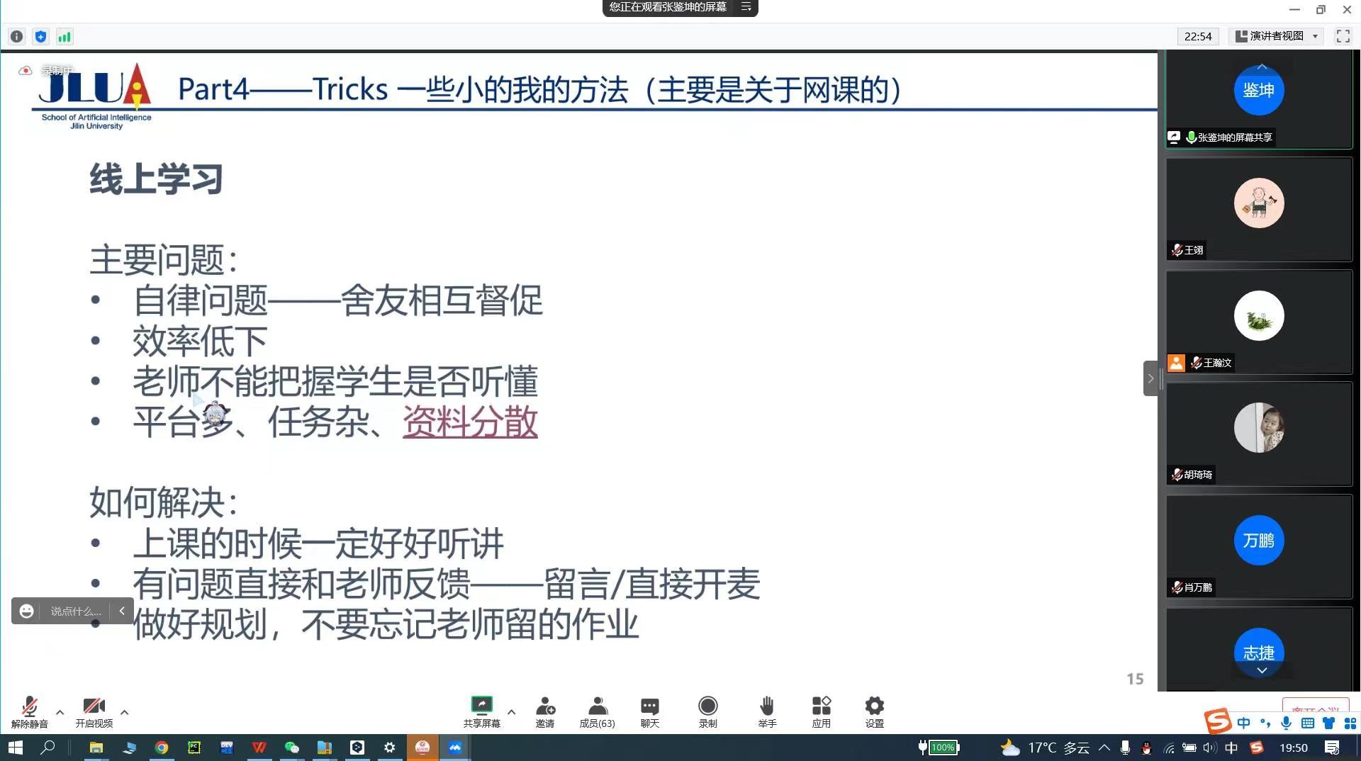 会上,20级张鉴坤学长就如何上网课于刚上大学应该思考什么分享了自己的宝贵经验。会议开始,鉴坤学长就大学学习的模式和其与常规认知中的不同之处对同学们做了简要概括。会议中,学长就“你想成为怎样的人”“如何安排好大学学习生活的时间”“如何寻找自己适合的学习方法”这三个问题展开说明了刚上大学应该思考的问题以及应对方案,让同学们对即将到来的老员工活有了更明晰的认知。又从上网课可能面临的问题及相应解决方案,从上课环境、学习效率、知识盲点、不同课程的不同处理方法、具体课程介绍这五个方面多维度地传授了网课学习的方法经验,令同学们受益良多。会议结束时,胡淑颖老师温馨提醒了同学们面对不同课程的网课平台不同的解决方法,并强调了专业课知识的重要性,让同学们能够更加自如地面对即将到来的网课学习生活。